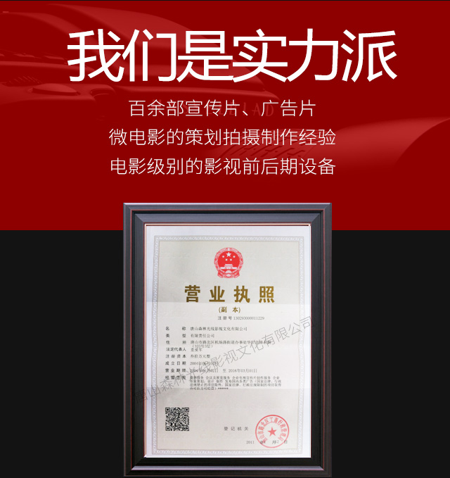 营销策划理念和影视艺术相结合是这家公司进行影视创作的特色,百余部宣传片、广告片和微电影的策划拍摄制作经验是他们赢得市场的利器,电影级别的影视前后期设备是每一部作品成功的硬件保证。